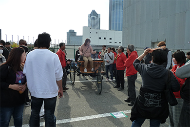 大きなフライホイールを回し、エンジンを始動させ、来場者の方を乗せて走る姿は圧巻です!