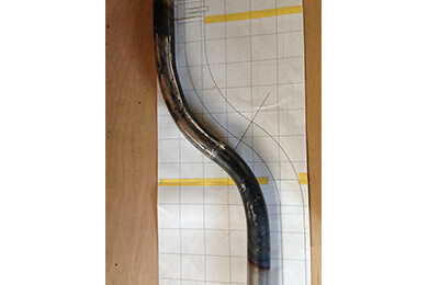3.CADで書いた図面を原寸大で印刷して、 曲げた鉄パイプと見比べます。 寸法通りの位置でパイプを切断し開先を作ります。