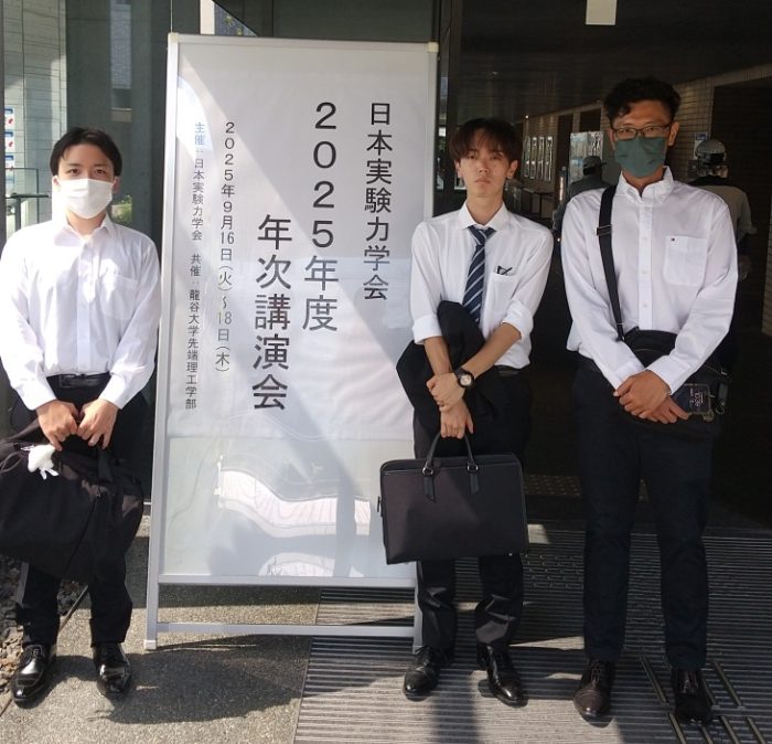2025年9月16日~18日にかけて、龍谷大学瀬田キャンパス(滋賀県大津市)で開催された「日本実験力学会 2025 年度年次講演会」において、本学機械工学科の学生3グループが研究成果を発表しました。発表は4件で、いずれも学外の専門家が集う全国規模の学会における口頭発表という、学生にとっては大きな挑戦となりました。