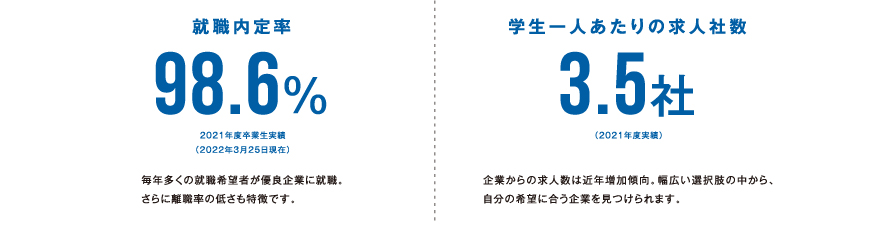 学生一人当たりの求人社数は114社(2024年度実績)と、過去最高を記録しており、多くの学生が優良企業に就職しています。
