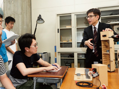電子機器で音を出力するには、電気信号を増幅してより高品位に音に変換するスピーカシステムが必要です。そこで、スピーカシステムにおける共鳴周波数の特性等を応用して音の再生できる帯域の拡大・制御をめざし、装置の設計・製作を行っています。