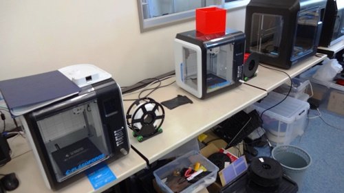 この演習室には7つの3Dプリンターがあります。作製できるオブジェクトの最大の大きさが異なります。